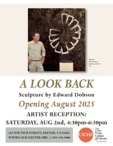 The Center for Art, Culture, and History- Exeter (CACHE), formerly known as the Exeter Art Gallery and Museum Association, rebranded in 2023 in order to communicate its new mission of bringing to life the art, culture, and history of California’s heartland. The new museum board hosts quarterly art exhibitions showcasing local and regional artists. CACHE’s historical displays are committed to telling the stories of the people and events that have shaped our Tulare County area from its earliest days. We are proud to present a variety of educational programs and unique community events, and we invite everyone to experience the rich culture of Exeter.