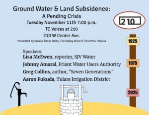“Groundwater and Land Subsidence – A Pending Crisis” will be a public forum presented by Tulare County Voices at 210, at 7 p.m. on Tuesday, Nov. 11 at 210 W. Center Ave.