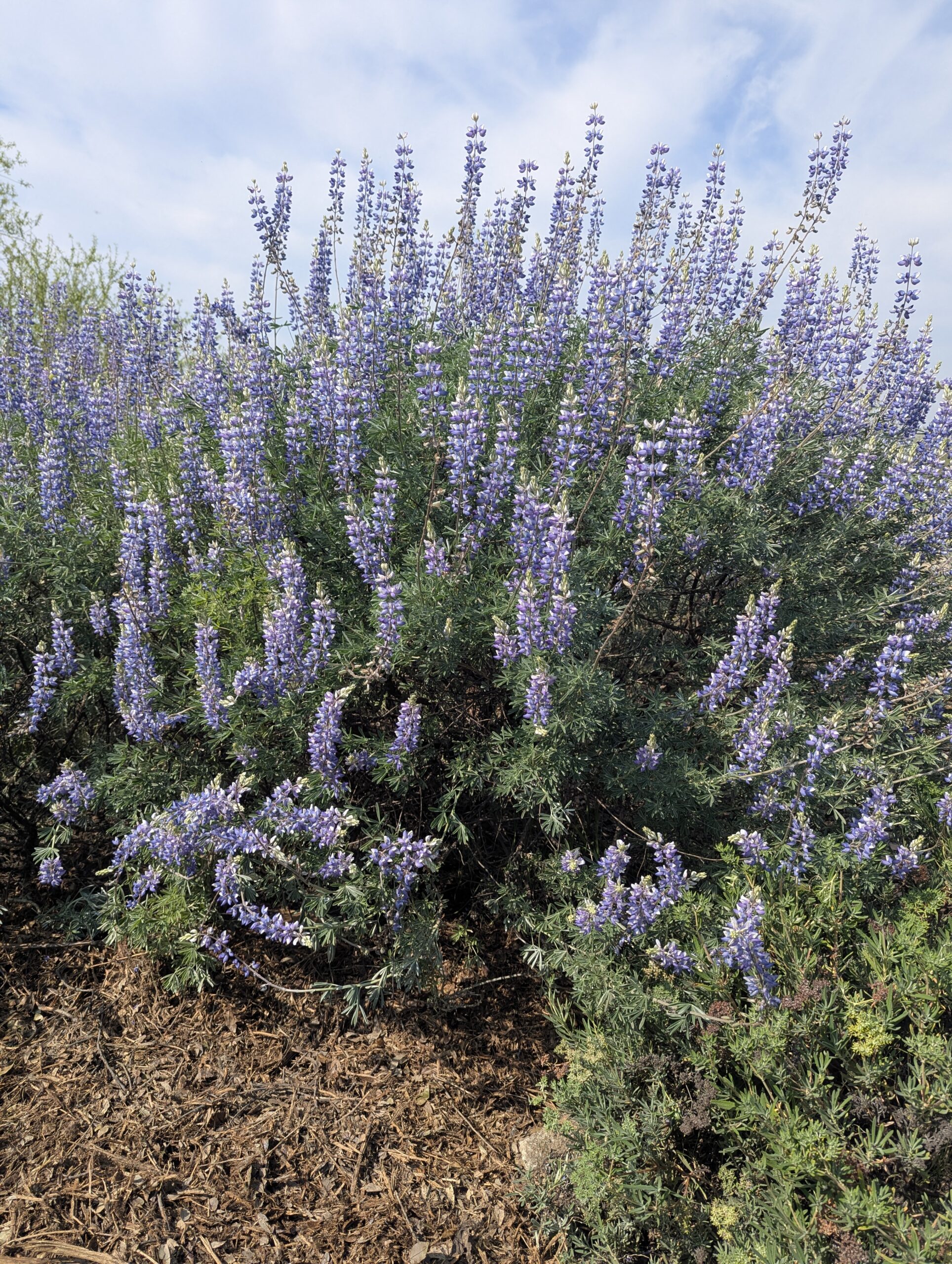 Silver Lupine are an evergreen shrub which provides year-round interest in the garden. It has attractive silver-green foliage that adds a pop of color in the garden. Then starting in February and lasting into April the bush boasts large flower spikes that range in color from pale blue to deep purple. The blooms are attractive to pollinators, especially bees.