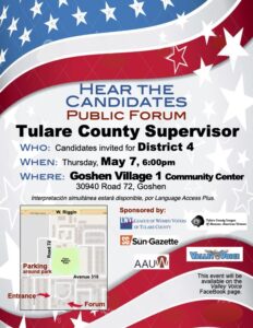 Voters in the primary election for District 4 Tulare County Supervisor will have the opportunity to meet the candidates at a forum on May 7 and ask them questions.